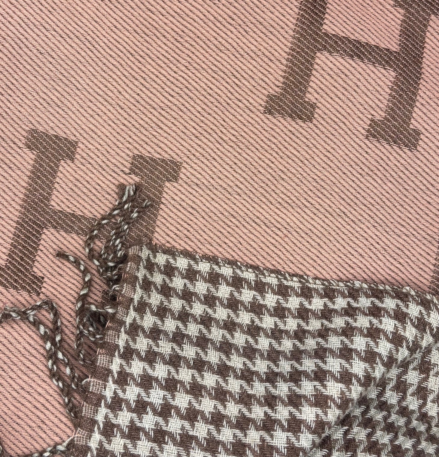 Pink and taupe, H print scarf with pale green and taupe check detail.