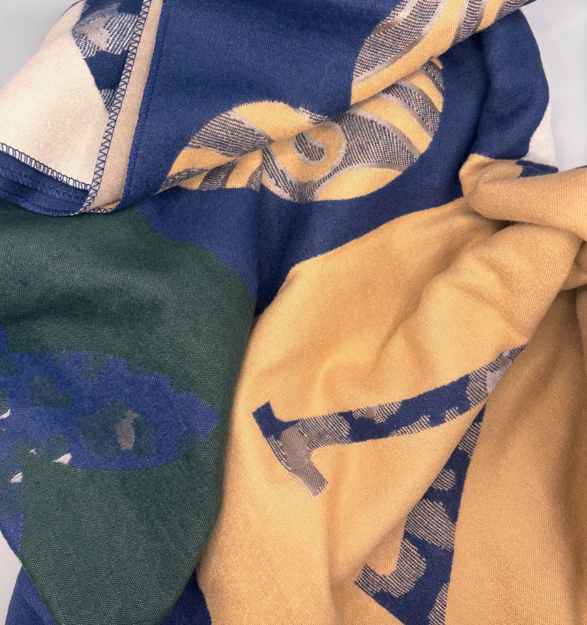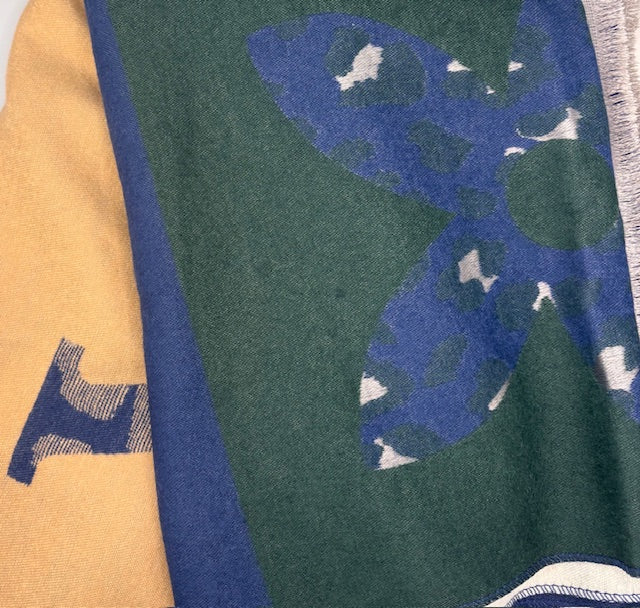 Cashmere scarf with a print in a mix of dark blue, tan, cream and green